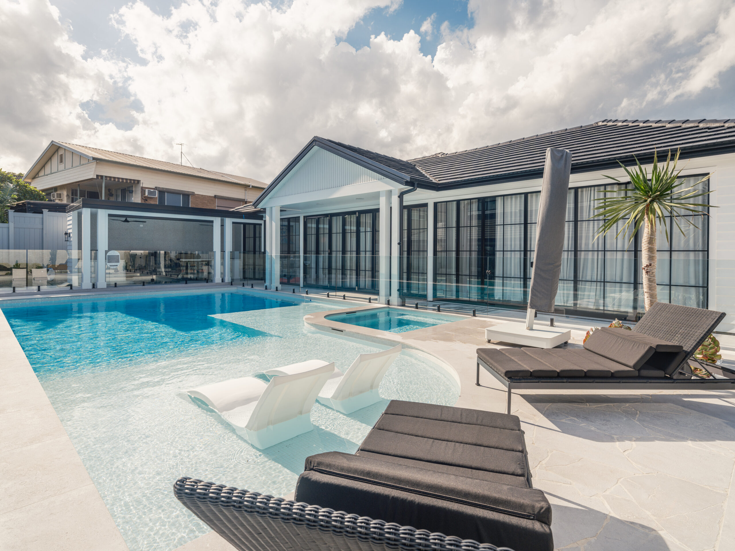 At Phillip Bay Residence in Sydney, designed by Design Native, Luna Chiaro Alfresco is used across the pool surrounds, alfresco paving and garden transition areas. A mix of custom formats — including 800 × 400mm pavers, 1000 × 1000mm slabs and pool coping — was selected to suit the scale of the site, while free-form crazy paving is introduced through the pool and garden zones to soften edges and create a more natural transition between structured paving and the surrounding landscape.