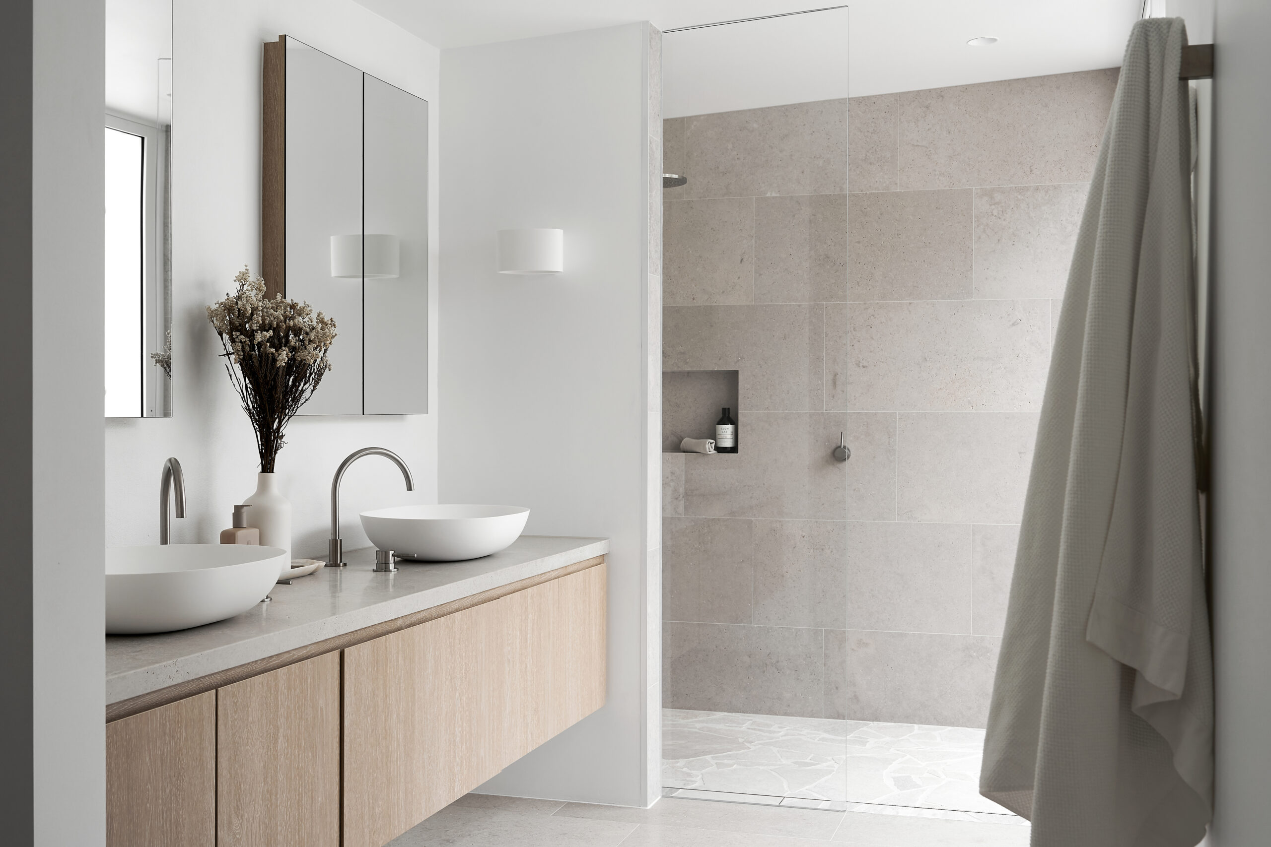 At the Bellevue Hill Project, designed by Anna Antoniades Architecture with interiors by Nicki Smoli, Luna Chiaro Alfresco extends from the pool surrounds through to the home’s entry. Crazy paving was also introduced to the shower floor, demonstrating how the material can transition seamlessly from outdoor entertaining areas into interior wet spaces without losing cohesion.