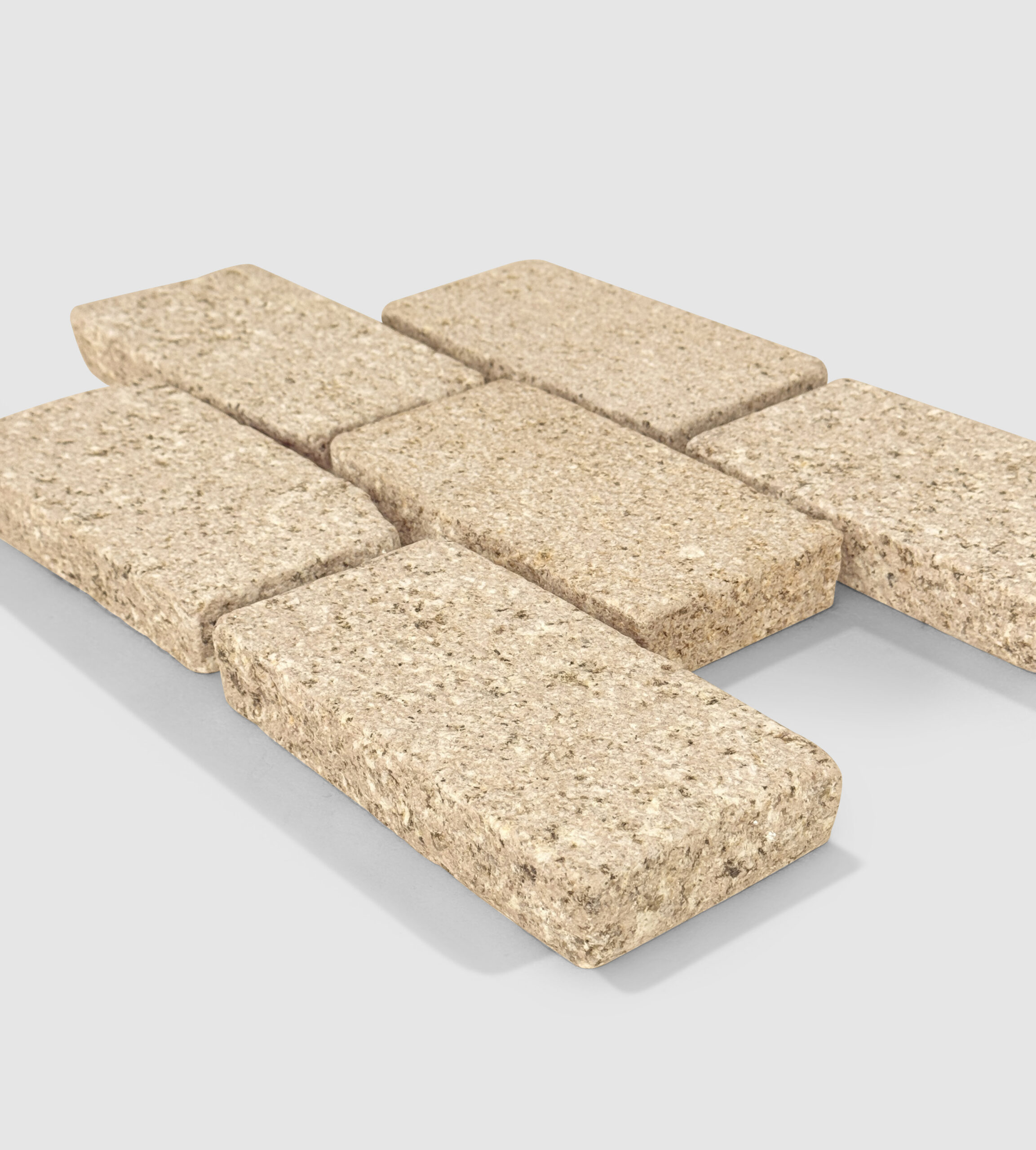Desert Sand Granite Rectangles Cobblestones from Sareen Stone showcase warm, golden-beige tones with a naturally textured finish, adding character and warmth to any outdoor space. Durable and slip-resistant, they’re ideal for driveways, pathways, courtyards, and landscaping in both residential and commercial settings.