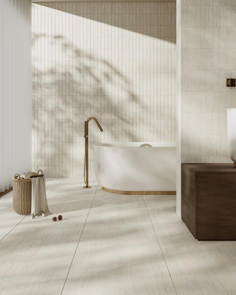 Available in Bianco and Sabbia, the collection reflects the timeless appeal of travertine, with soft tonal variation and gentle veining that bring depth and warmth to a space.