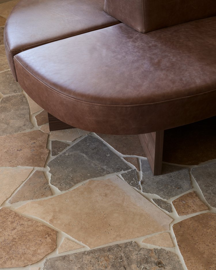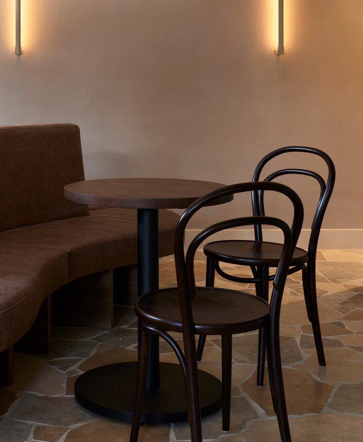 Paired with leather banquettes, bentwood chairs and warm ambient lighting, the travertine anchors the interior — adding a tactile, considered layer to the overall experience.
