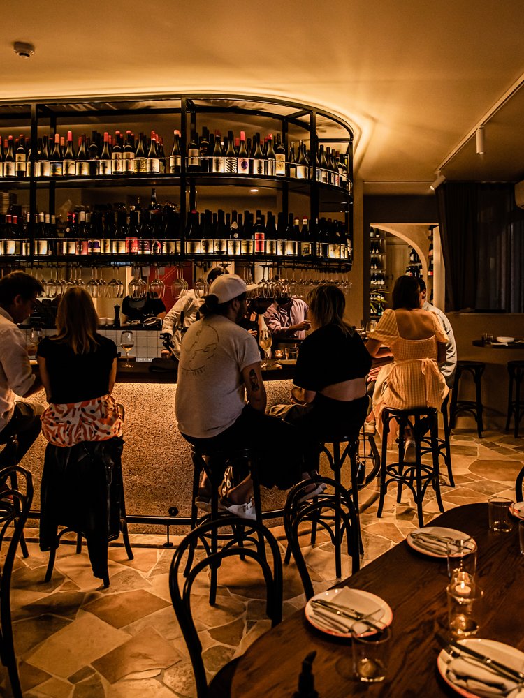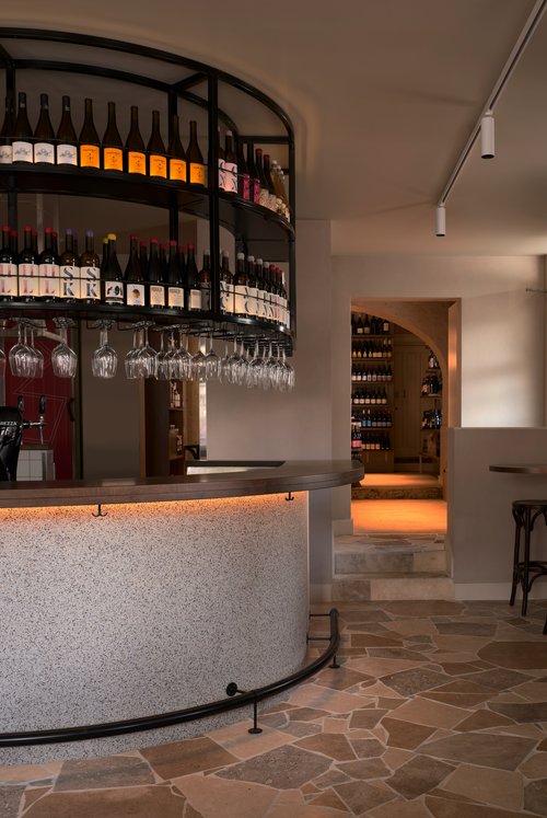 The stone continues throughout the space, from the main bar entrance through to the more intimate wine room, creating a sense of continuity without repetition.