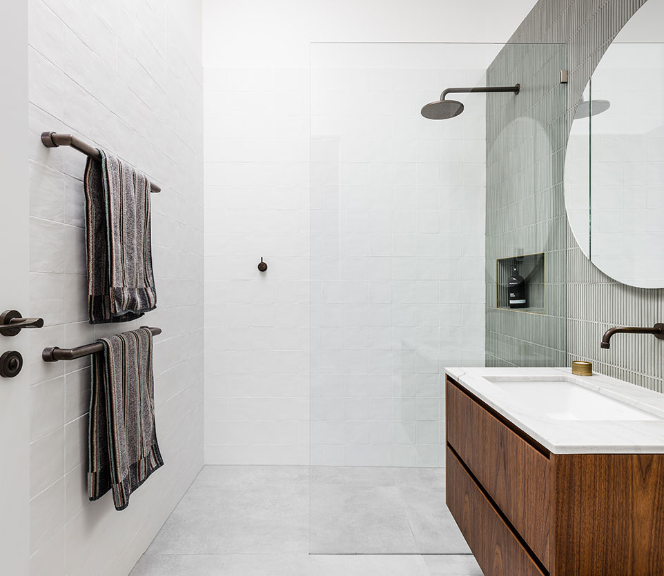 The LA contemporary look and detail leading into the house from the front door was something that we just loved. Along with having one row of tiles that runs along the inside of the glass sliding doors leading into the living/dining room from the alfresco space was also a unique detail we wanted to include.
