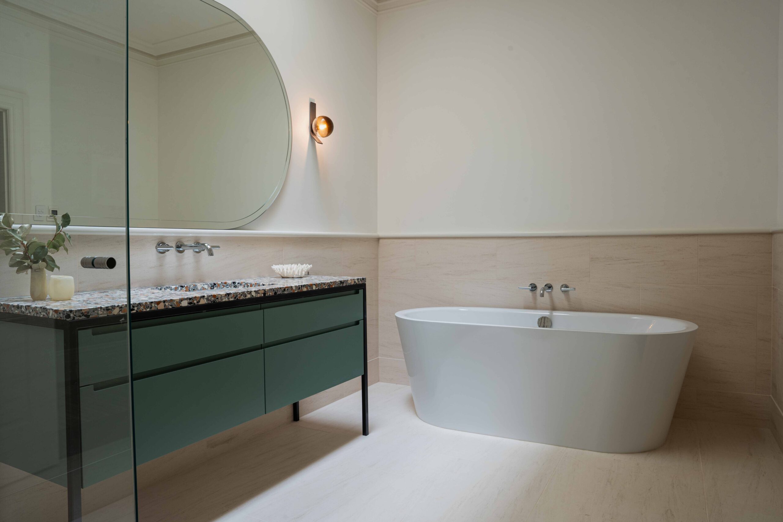 At the Mittagong House project in the Southern Highlands, interior designer Suzanne Green selected Santa Fe Limestone in a honed finish for the bathrooms, with a clear intent to create spaces that felt elegant, timeless and restrained.