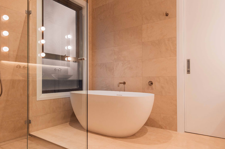 Similarly, to the rest of the project, Turrell selected a light-coloured stone for the bathroom to provide a calming aesthetics and feel.